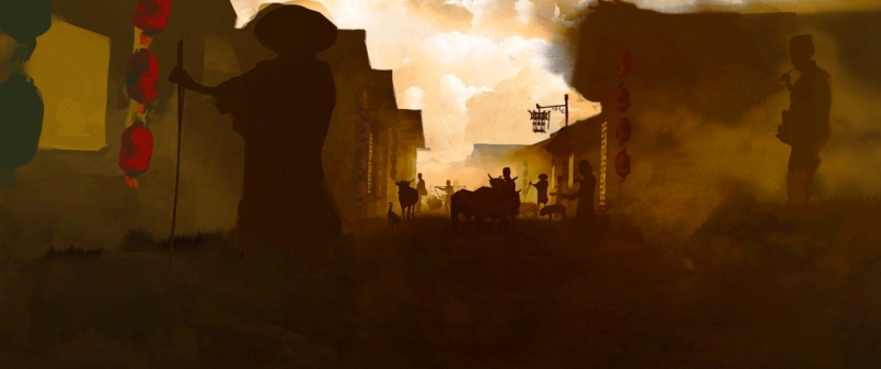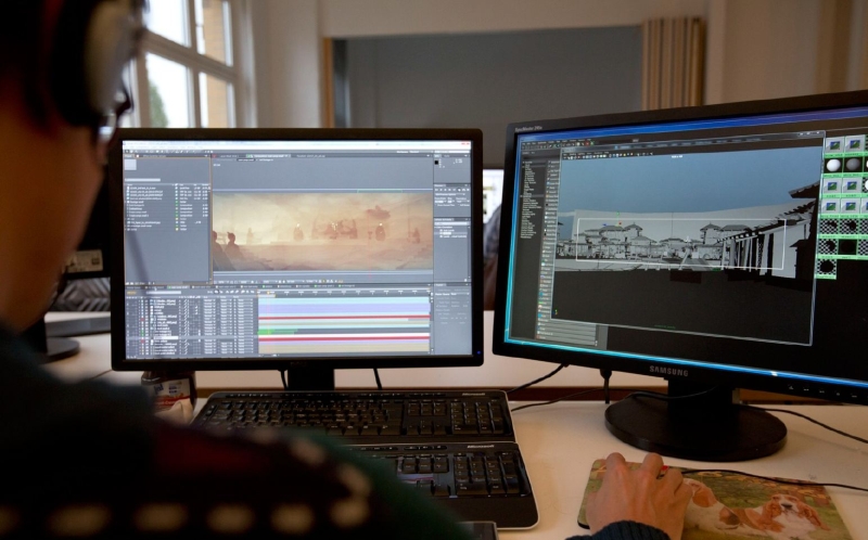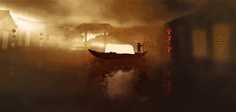 The resolution was very demanding in terms of rendering and performance. Therefore I choosed to use near real-time 3d images. To quickly integrate live-action actors, I painted the shadows and details directly on their body.