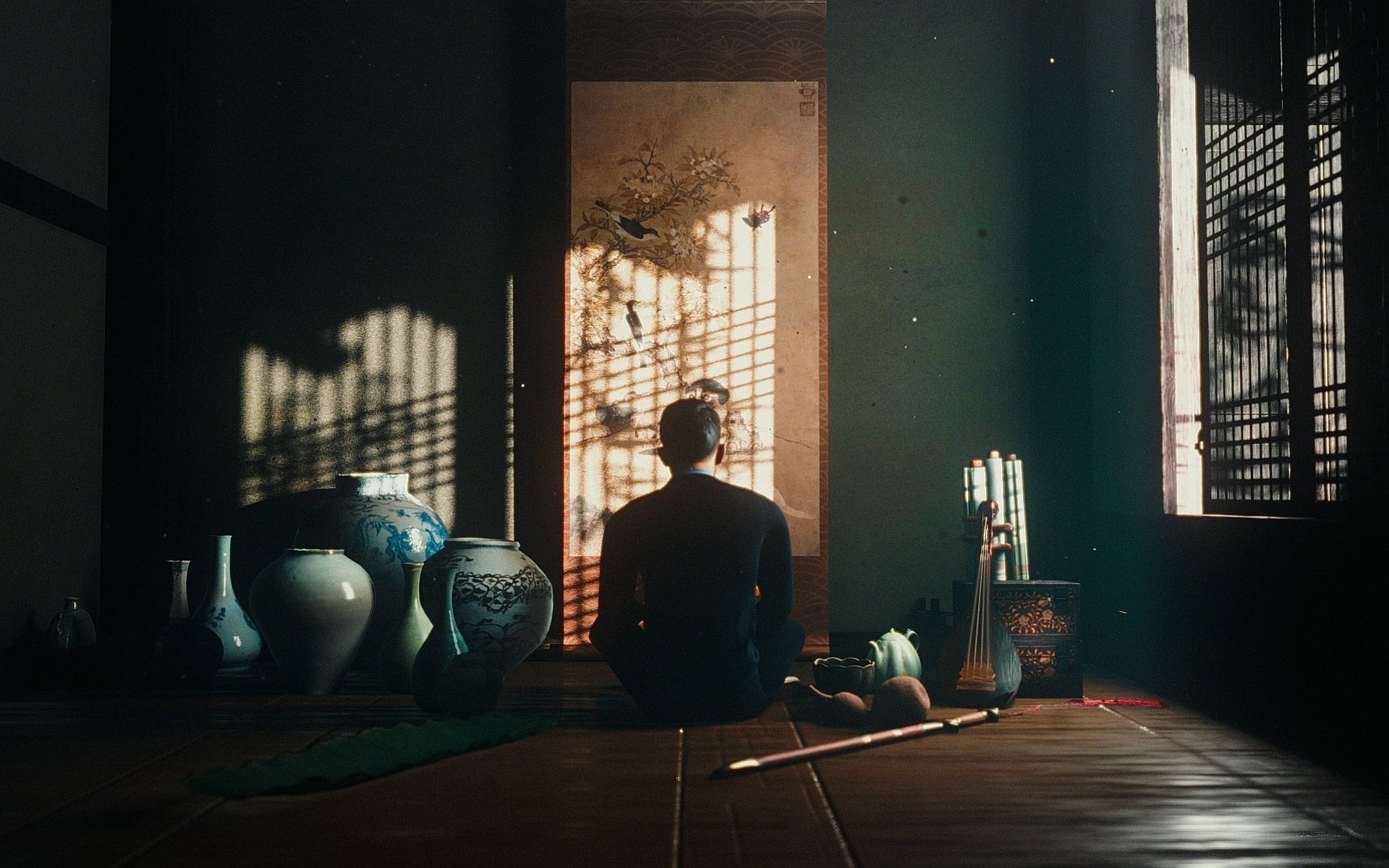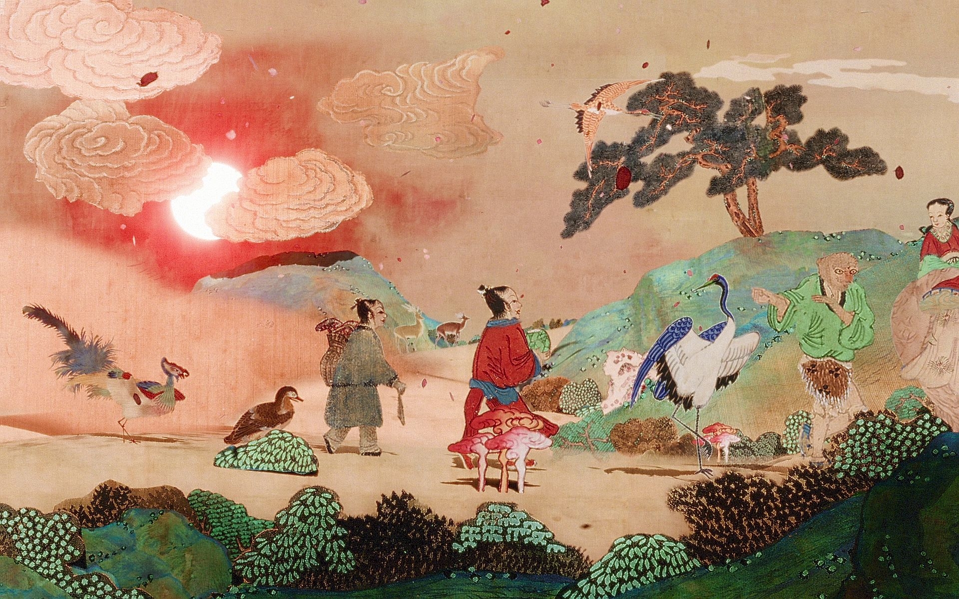 A collector, sitting among his works of art, enters into deep meditation. Little by little, he frees his mind, enters a trance and plunges into a waking dream, floating through valleys and mountains populated by immortals, fantastic animals, through the clouds and the seas.
